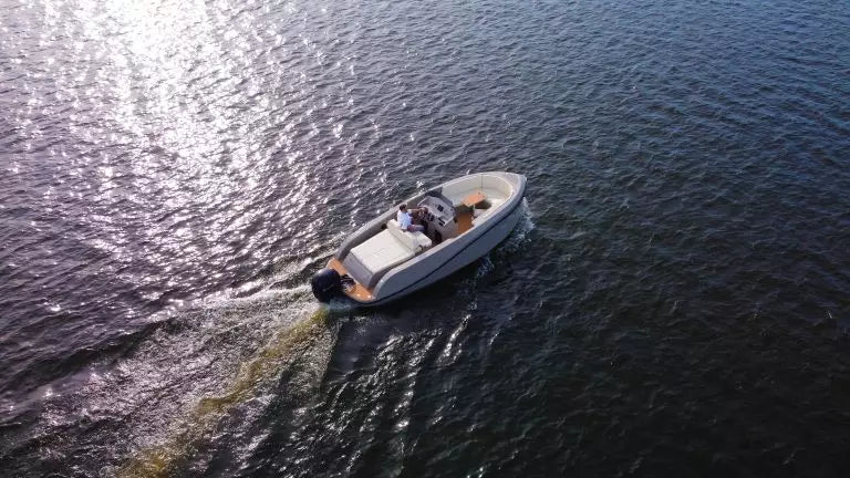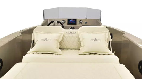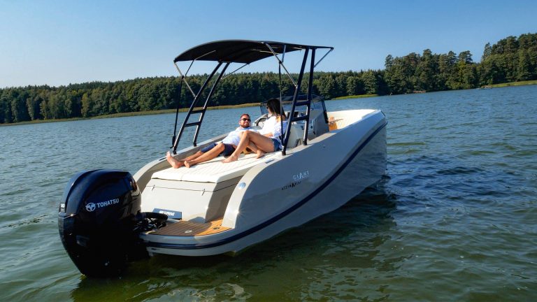 Giant 660, combines the tourist function of sleep units with fast, sporty sailing. Convenient communication between the front and the back of the boat. Great nautical properties. Very solid construction. The console allows for convenient control both in a standing and sitting position. Comfortable railings have been designed on the console for greater safety. The console body is constructed in such a way that it provides many possibilities for mounting accessories, you can also mount a stationary refrigerator on its front wall. Railings have been designed in the front part of the boat, which also create a base for the sun deck. In the sun deck, we have designed a cutout so that you can use the table while the front sun deck is unfolded. The rear helm’s backrest  can be adjusted to create a very large and comfortable place for sunbathing. The boat has 4 large storage compartments at the front and a huge storage compartment under the rear sofa. A large pull-out ladder with wooden steps that is very comfortable to enter. At the front of the boat there is a stainless steel fender cover and a stylish mooring eye. As standard, the 660 model is equipped with attractive pull-out cleats. The boat’s deck is self-draining.
